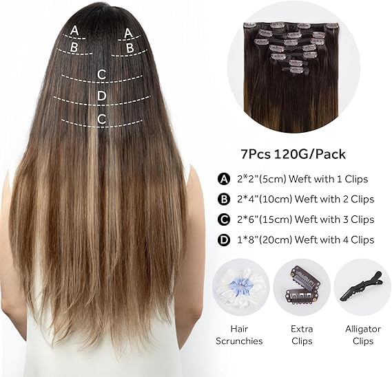 - مواصفات وصلات الشعر: 7 قطع نسيج شعر (العرض: 20 سم× 1، 15 سم× 2، 10 سم× 2، 5 سم× 2) مع 14 مشبكًا بوزن 120 جم، 5 أنواع من الأطوال، يمكنك الاختيار وفقًا لاحتياجاتك. مجموعة واحدة فقط تكفي لإكمال الرأس بالكامل، بينما يمكن ارتداء 2-3 مجموعات للحصول على مظهر أكثر امتلاءً.