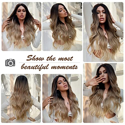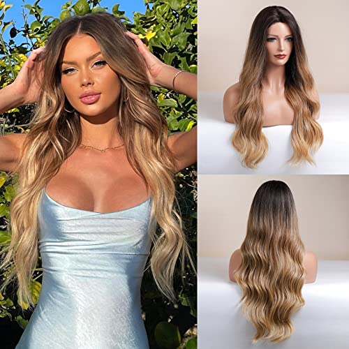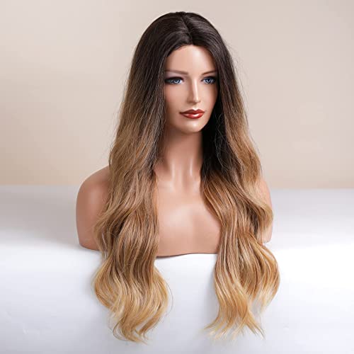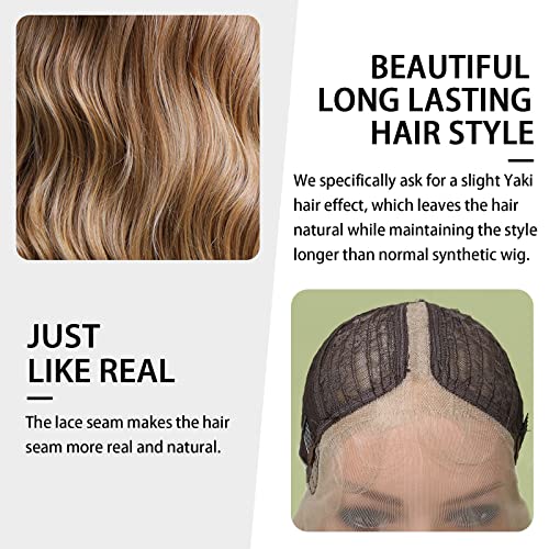 ECIF - شعر مستعار طويل بلون أشقر مع دانتيل أمامي من اي سي اي اف، شعر مستعار مجعد بلون أشقر عسلي متدرج للنساء، شعر مستعار صناعي طبيعي بدون لاصق للاستخدام اليومي - (71.1 سم)