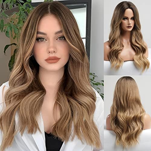 ECIF - باروكة بني طويلة وكيرلي بفرق من المنتصف للنساء، باروكة مقاومة للحرارة بجذور بني غامق من شعر صناعي بمظهر طبيعي من ECIF