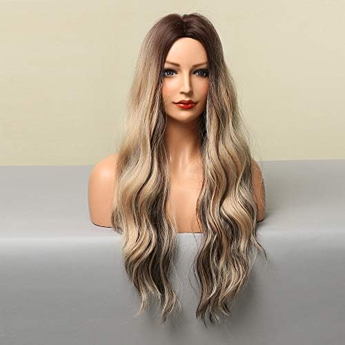 ECIF - شعر مستعار طويل مجعد من اي سي اي اف، شعر مستعار طبيعي مموج متدرج بجذور بني غامق الى اشقر، شعر مستعار صناعي اسود مختلط من الياف صناعية مقاومة للحرارة للنساء للحفلات التنكرية