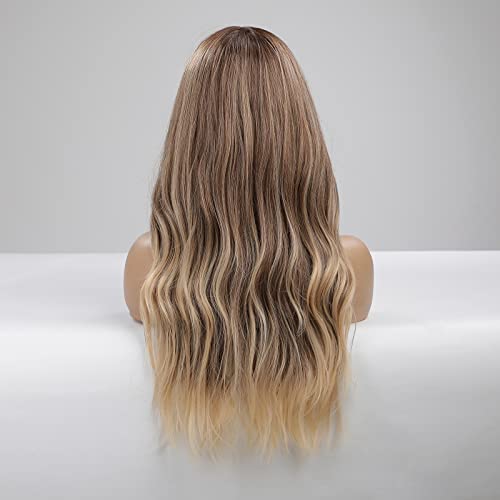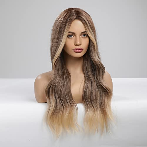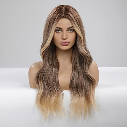 ECIF - باروكة شعر مموج طويل صناعي باللون البني مع خصلات شقراء لمظهر طبيعي وأنيق للنساء من اي سي اي اف