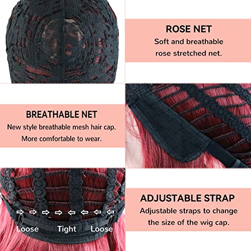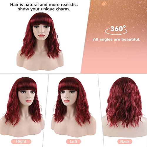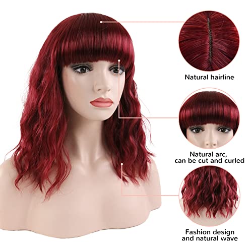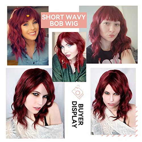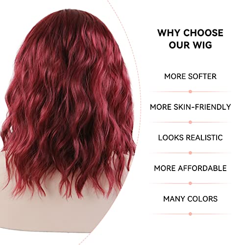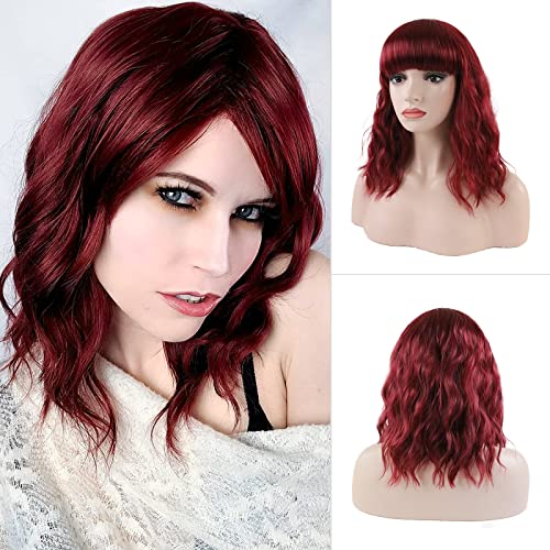 ECIF - شعر مستعار احمر نبيذي للنساء من اي سي اي اف، شعر مستعار قصير مموج بورغندي بطول 14 انش مع غرة من الالياف المقاومة للحرارة بطول الكتف 99J لحفلات الهالوين التنكرية