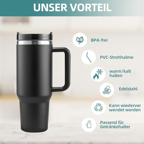 ecosystem - مج حراري مزود بشفاطة ويد وغطاء، مج محمول للقهوة بجدار مزدوج معزول بتقنية التفريغ الهوائي من الفولاذ المقاوم للصدأ، مج للسيارة للمشروبات الساخنة والباردة من ايكو، سعة 1.2 لتر، أسود