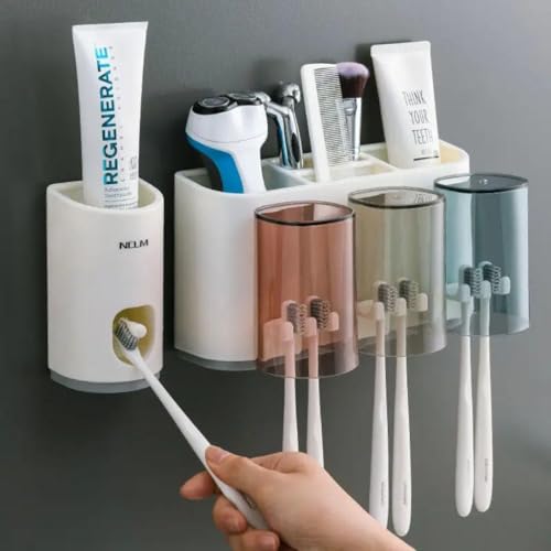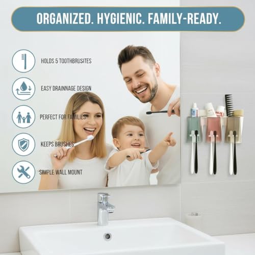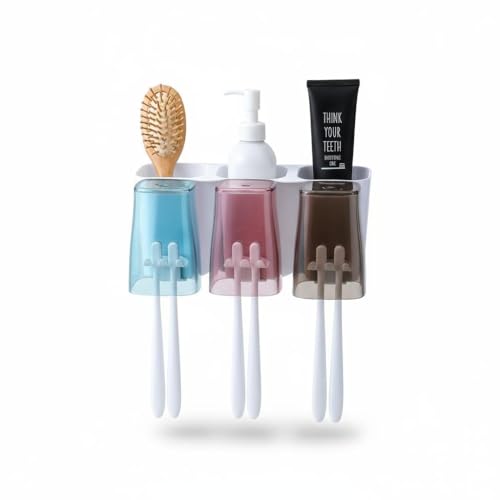 Generic - منظم حمام صديق للبيئة - حامل فرشاة اسنان يثبت على الحائط مع 3 اكواب مربعة، سعة كبيرة للاستخدام العائلي او السكن او الشخصي