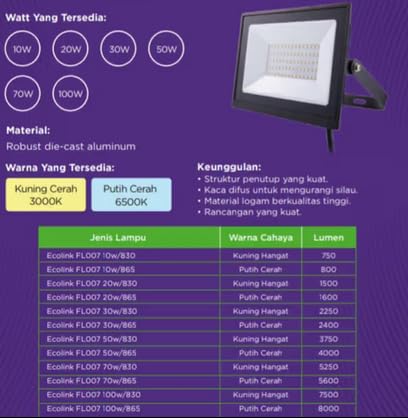Generic - مصباح كشاف ابيض 50 واط من ايكو لينك، مصمم لتحمل الظروف الخارجية القاسية FL007 G2 50 واط/865، كفالة 3 سنوات