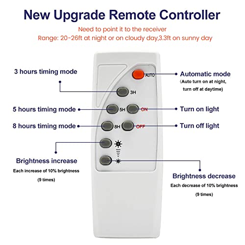 - 【 بطارية إصدار جديد】---مصابيح ليد الشمسية مدمجة في بطارية طاقة جديدة لمركبات الطاقة (3.2 فولت/22 أمبير في الساعة) وهي أطول فترة وأمان واستقرار من بطارية فوسفات الحديد الليثيوم 32650 و18650. وقت العمل يصل إلى 11 ساعة بعد 6-8 ساعات من الشحن الكامل، حوالي 36 ساعة في الوضع الخافت.