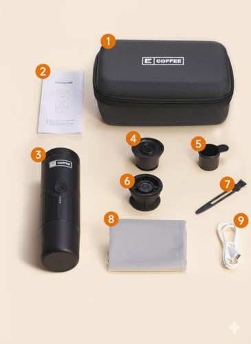 - مجموعة كاملة: تتضمن ماكينة تحضير القهوة ومحول من الفولاذ المقاوم للصدأ ومحول كبسولة وشنطة منظمة وكوب قهوة للسفر.
