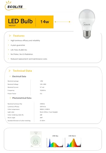 ECOLITE - مصباح ليد 14 وات بضوء أبيض دافئ 3000 كلفن 1400 لومن من ايكولايت، PF0.5، A65/E27