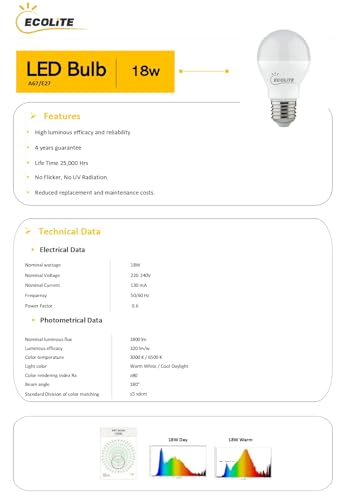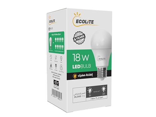 ECOLITE - لمبة ليد 18 وات بضوء أبيض دافئ 3000 كلفن 1800 لومن من ايكولايت، معامل قدرة 0.5، A67/E27