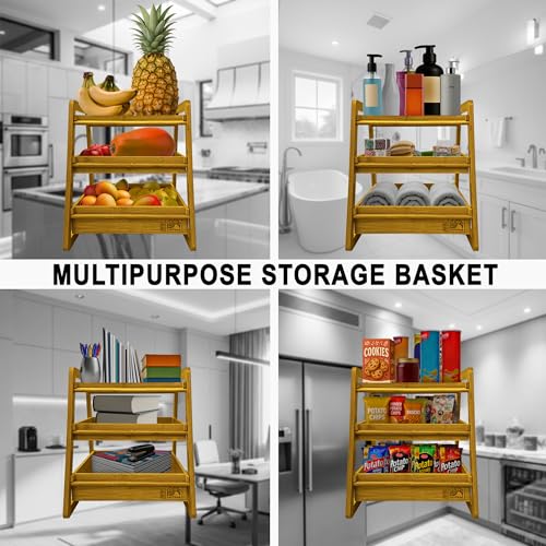 - ديكور وتخزين متين من الخيزران: يتميز رف تخزين الفاكهة والخضروات المكون من ثلاث طبقات بسلات وإطارات مصنوعة من الخيزران المرن! توقع أن يدوم جماله ومتانته لسنوات، حيث يقدم لعائلتك يوميًا كرف طعام مثالي.