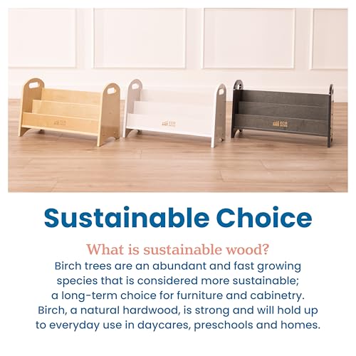 - عرض كتب الأطفال: رف كتب للأطفال الصغار مصمم للاستخدام على سطح المكتب أو الأرض مع فتحتين متجهتين للأمام لتشجيع الأطفال على اختيار كتبهم المفضلة بشكل مستقل في غرفة اللعب أو المدرسة