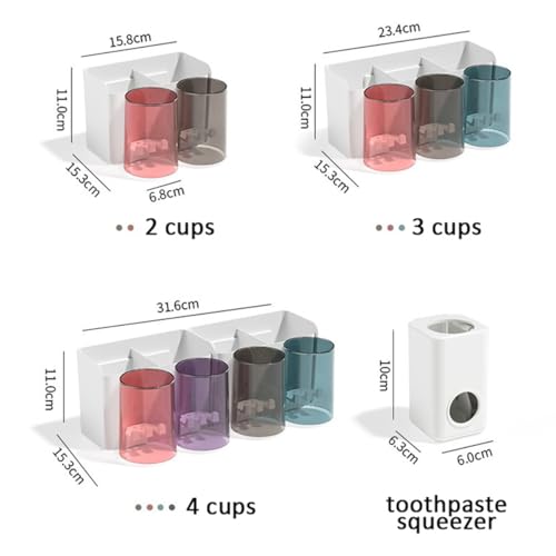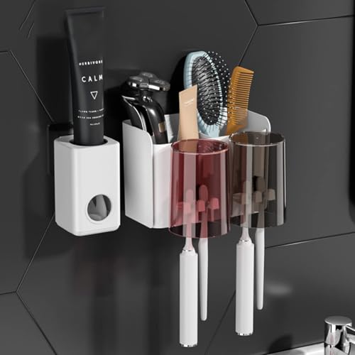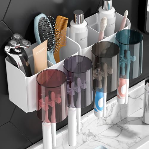 - حامل فرش أسنان مع موزع معجون أسنان – متعدد الوظائف، مزود بأقسام تخزين متعددة، حامل يثبت على الحائط، موفر للمساحة، يحتوي على فتحات فرش الأسنان، أكواب وأدراج، مع عصارة اوتوماتيك لمعجون الأسنان للحمام.