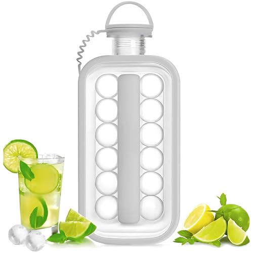 ECVV - اي سي في في غلاية صنع كرات الثلج 2 في 1 - زجاجة صينية مكعبات الثلج المحمولة مع 17 قالب دائري | خالية من البيسفينول ايه ومانعة للتسرب للمشروبات الباردة والقهوة والعصير والمزيد (رمادي)