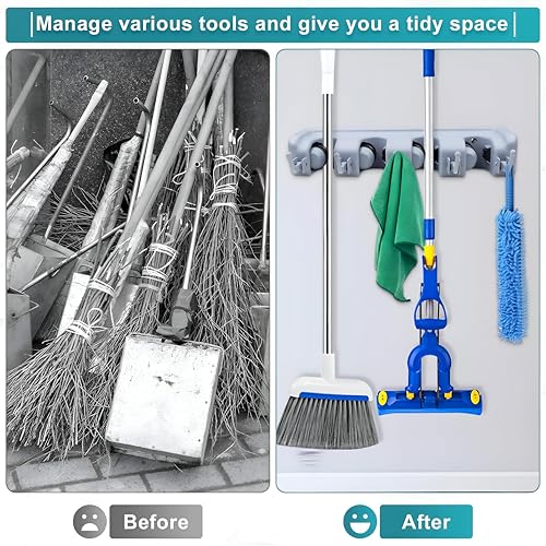 - يضمن هذا الحامل متعدد الأغراض التنظيم الأمثل في غرف المرافق أو المرائب أو الحدائق. إنه مفيد بشكل خاص للحفاظ على مواد التنظيف في متناول اليد مع تقليل الفوضى. تمنعها القدرة على حمل المماسح وعصي المكنسة والأدوات الأخرى بإحكام من السقوط أو شغل مساحة أرضية غير ضرورية ، وبالتالي تعزيز روتين التنظيف.