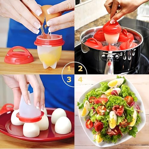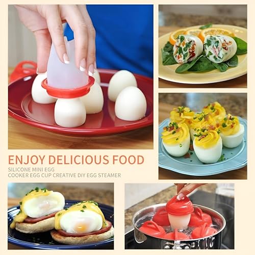 - إن جهاز طهي البيض المسلوق هذا مثالي لتحضير البيض بدقة. ما عليك سوى وضع كمية صغيرة من الزيت على الجدار الداخلي للكؤوس، ثم كسر البيض فيها وإضافة المكونات المفضلة لديك مثل السلطات. ثم قم بغمر أكواب البيض في الماء المغلي لمدة 10-15 دقيقة لطهي البيض. إنه بديل رائع لصنع بيض مسلوق تمامًا.