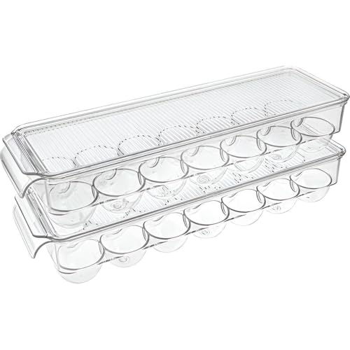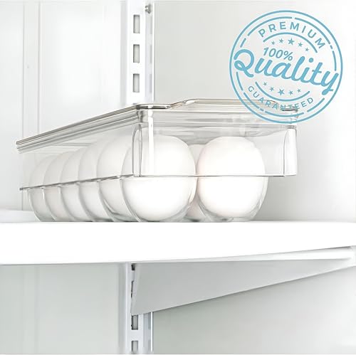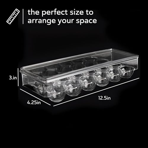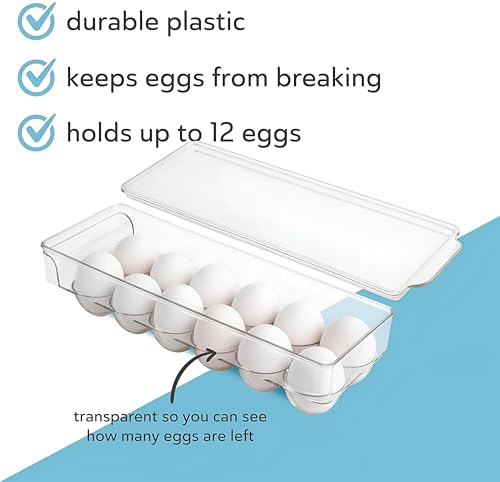 - يمكن لصينية البيض البلاستيكية الشفافة استيعاب ما يصل إلى 12 بيضة وتوفر رؤية واضحة لسهولة مراقبة إمدادات البيض. حامل البيض القابل للتكديس هذا مثالي لصنع ثلاجة نظيفة ومنظمة، ويشغل مساحة أقل.