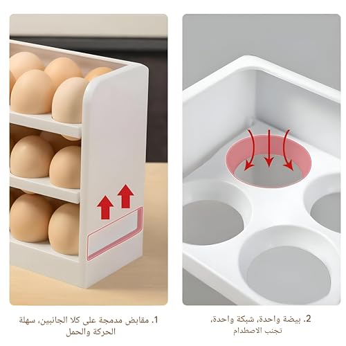 - 【سهل الاستخدام】حامل البيض هذا مزود بمقابض جانبية مريحة، مما يجعل من السهل سحبه ونقله. مثالي للاستخدام في المطابخ والثلاجات والفريزر ومخزن المؤن والدواليب وحتى للتخييم أو النزهات، مما يوفر المزيد من الراحة.