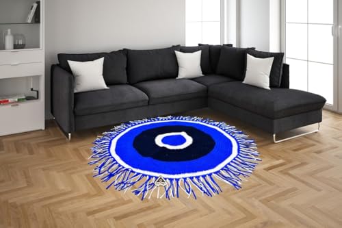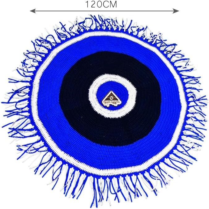 Egypt Antiques - سجادة دائرية مصنوعة يدويا من القطن الطبيعي من ايجيبت انتيكس، لون أبيض/أزرق/أسود
