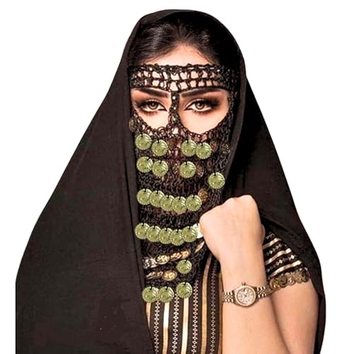 generic - برقع برقع اسود مصري مع عملات ذهبية اللون، زي رقص شرقي وعصابة راس وعملات كروشيه وقناع وجه ووشاح قبلي بدوي وغجري شرقي صناعة يدوية في مصر. مقاس واحد