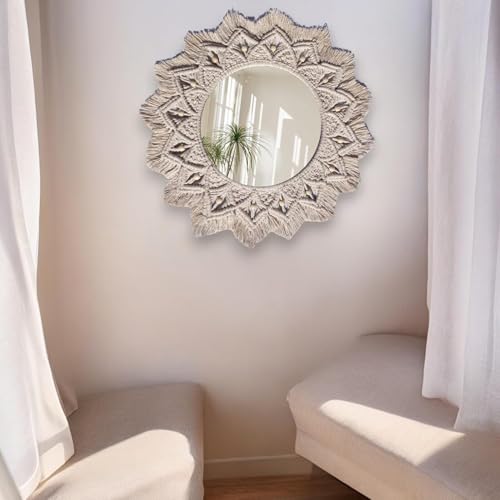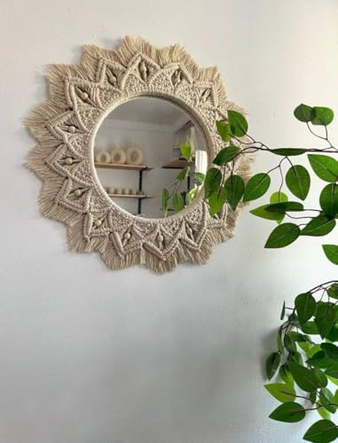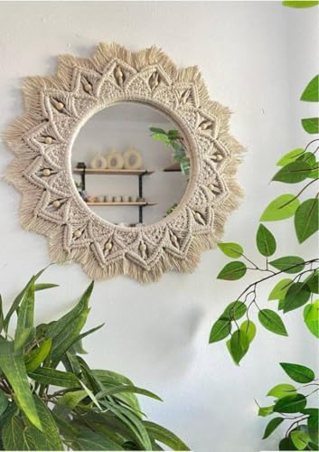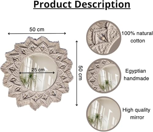 Generic - مراية حائط مكرمية مصرية مصنوعة يدويًا من القطن الطبيعي، زجاج دائري، نمط بوهيمي، ديكور مطرز، إطار 50 × 50 سم، مراية 25 سم