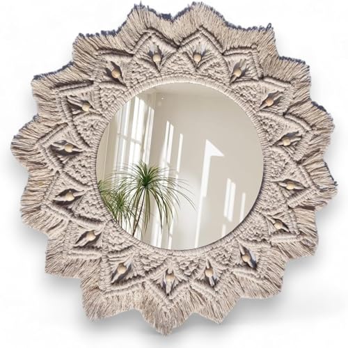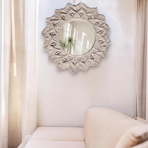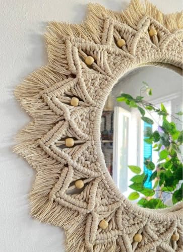 - مكرمية مصنوعة يدويًا: هذه المراية مصنوعة يدويًا بدقة باستخدام فن المكرمية القديم، مما ينتج عنه قطعة فريدة وفريدة من نوعها.