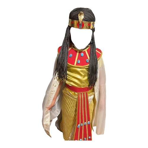 Generic - طقم زي الأميرة الذهبية الفرعونية المصرية مع اكسسوارات حمراء، فستان بطابع مصر القديمة مع غطاء للرأس ورداء