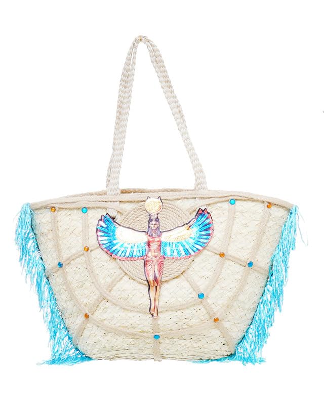 Generic - شنطة يد كبيرة توت للشاطئ على الطراز المصري بتصميم إلهة مجنحة، شراشيب زرقاء، قماش كريمي