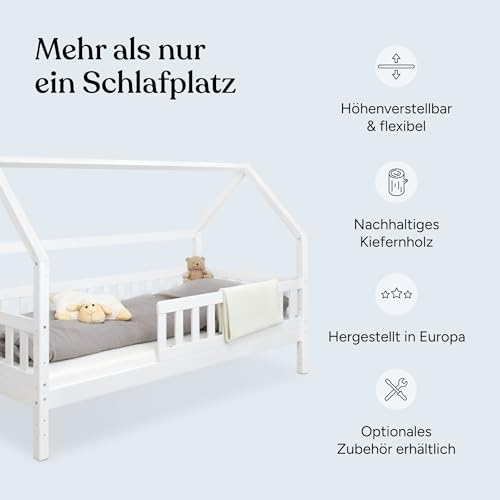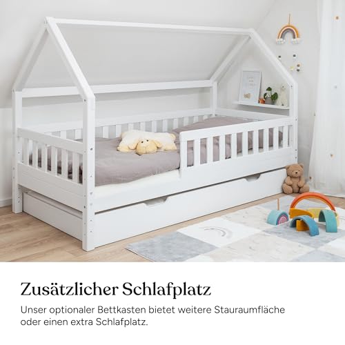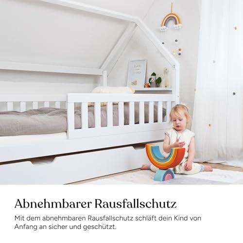 Ehrenkind - سرير أطفال منزلي من ايرين كيند® مع واقي من السقوط قابل للإزالة من خشب صلب معتمد من مجلس رعاية الغابات يتضمن إطار مضلع وأدراج تخزين، سرير أطفال منزلي مقاس 90 سم × 2 متر، بلون أبيض