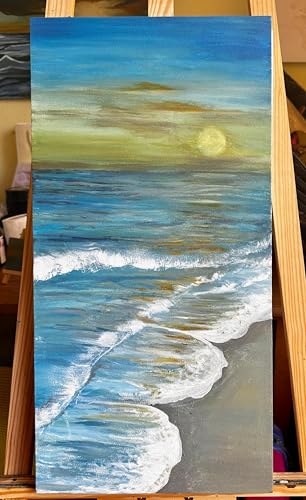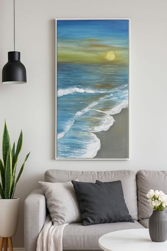 Generic - لوحة فنية جدارية من القماش التجريدي الحديث من اي كيه ديزاينز، لوحة اكريليك مرسومة باليد، 30 × 60 سم، الوان ازرق واصفر وابيض، امواج البحر مع شروق الشمس، عمل فني معاصر