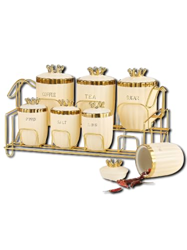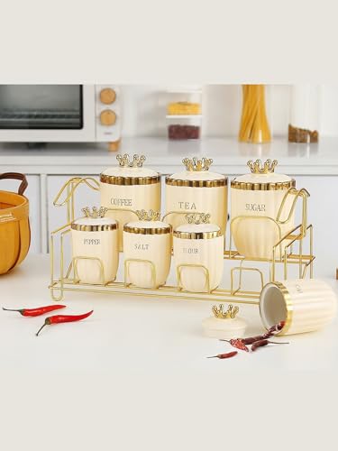 - تخزين منظم للمطبخ: يحتوي هذا الطقم الأنيق على 7 علب مع أغطية لتخزين القهوة والشاي والسكر والتوابل والدقيق والملح، مرتبة بدقة على رف معدن.