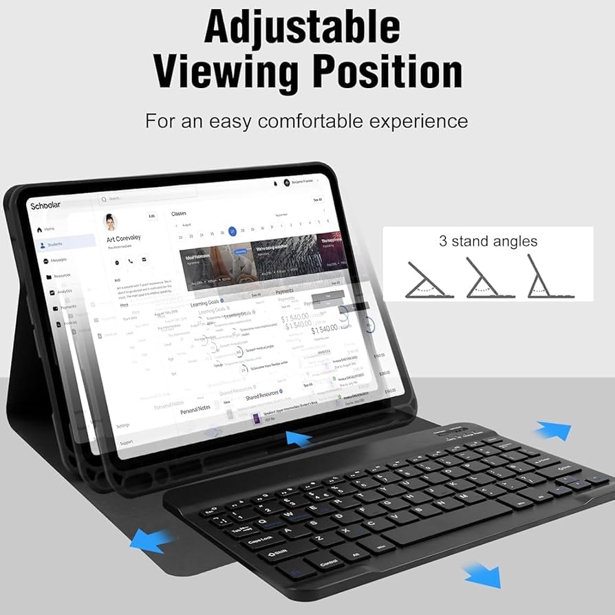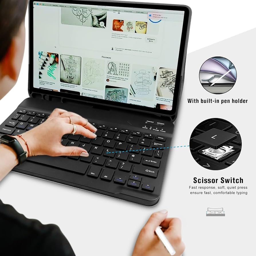 - 【كتابة مريحة وهادئة】 تحتوي مفاتيح لوحة المفاتيح البلوتوث على قاعدة مقص وآلية زنبركية أسفل كل مفتاح توفر ردود فعل لمسية في كل مرة تلمسها، مما يؤدي إلى نقرة أكثر هدوءًا عند الكتابة وكتابة أسرع من شاشة اللمس. يحتوي جراب اي باد اير 11 M2 2024 الجلدية على فتحة قلم مدمجة لمنع فقدان القلم. (لا تتضمن العبوة القلم)