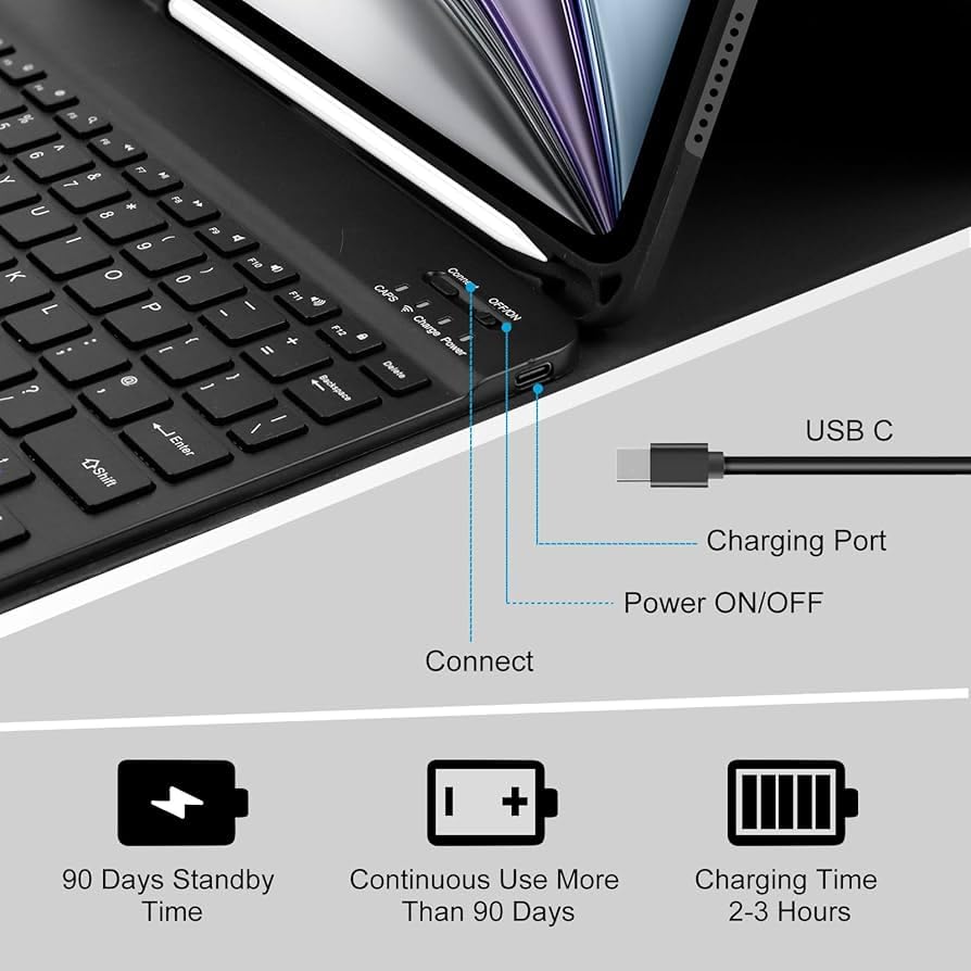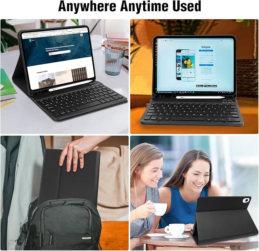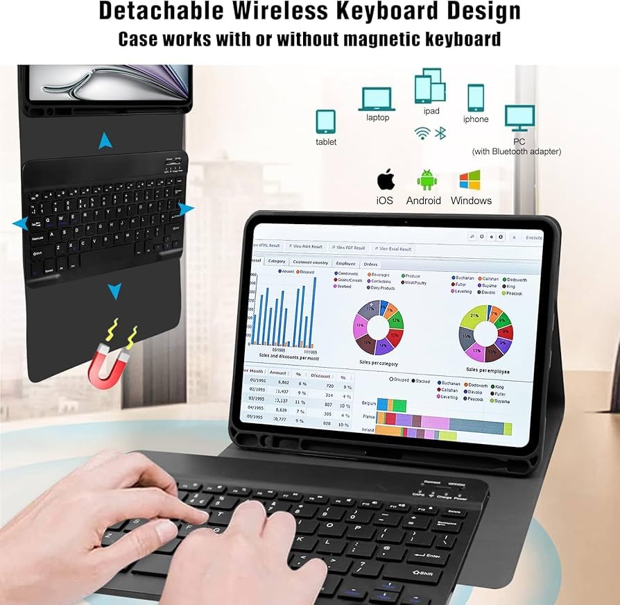 - 【لوحة مفاتيح بلوتوث لاسلكية قابلة للإزالة】 يستخدم جراب لوحة مفاتيح اي باد اير 11 2024 تصميمًا مغناطيسيًا منفصلًا يمكن إزالته بسهولة عندما لا تكون هناك حاجة إلى لوحة المفاتيح. توفر لوحة المفاتيح البلوتوث لاي باد اير 11 M2 إدخالًا هادئًا وسلسًا وسريع الاستجابة. (نطاق الاتصال يصل إلى 10 أمتار)