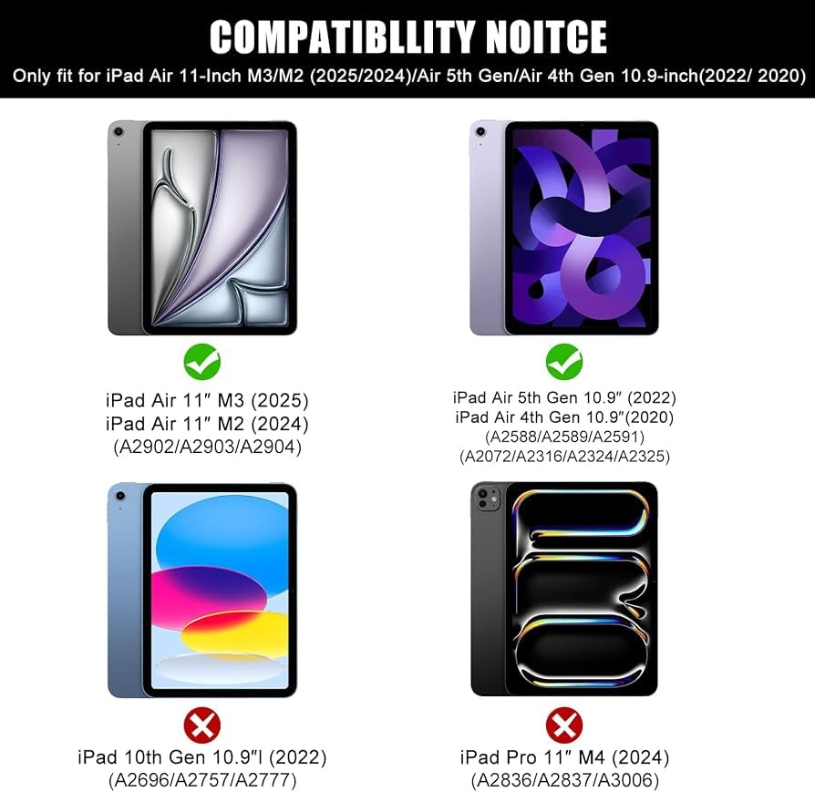 - 【توافق لوحة مفاتيح اي باد اير 11】جراب لوحة المفاتيح هذه متوافقة فقط مع اي باد اير 11 بوصة M2 2024 (الموديل: A2902 A2903 A2904)؛ اي باد اير الجيل الخامس 2022 (الموديل: A2588 / A2589 / A2591)، اي باد اير الجيل الرابع 4 2020 (الموديلات: A2324/A2072/A2316/A2325). يرجى التأكد من رقم الموديل الموجود على الجزء الخلفي من جهاز اي باد الخاص بك قبل الشراء