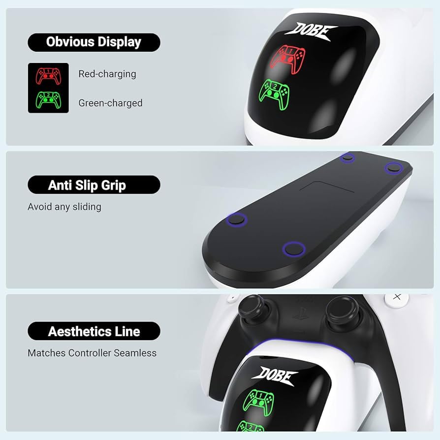 - 🎮【حامل شحن ثابت مدمج】 قاعدة شحن مدمجة وأنيقة لأجهزة التحكم دوال سينس لبلايستيشن5، لن يشغل مساحة كبيرة على مكتب الألعاب الخاص بك. لا تستطيع فقط شحن اثنين منأذرع التحكم الخاصة بك لجهاز بلاي ستيشن 5 ولكن يمكنك أيضًا استخدامه كحامل تخزين لوحدة التحكم. إذا كان لديك أي مشاكل لا تتردد في التواصل مع الدعم الفني لدينا، مع ضمان الجودة لمدة عام.