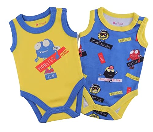 Elsayaad - عبوة مكونة من 2 قطعة سالوبيت بكباسين من القطن باكمام قصيرة ورقبة دائرية - لون اصفر وازرق، من سن 9-12 شهر