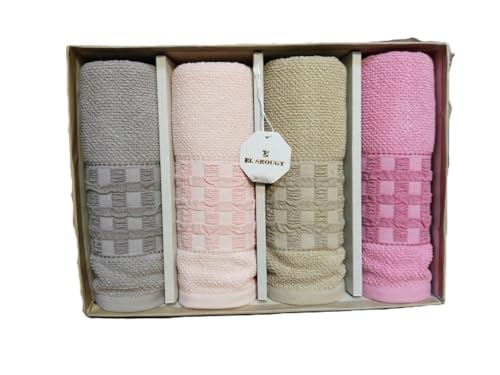 - محتويات الطقم: مجموعة من 4 قطع فوط قطنية من El Srougy بألوان متنوعة (رمادي، وردي فاتح، بيج، زهري)