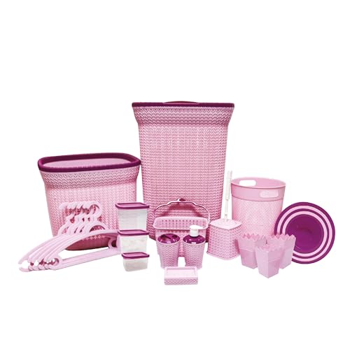 EL Watania - مجموعة اكوا 25 قطعة من الوطنية؛ 1 سلة ملابس بغطاء/1 سلة ملابس/1 سلة مهملات/6 شماعات ملابس/1 مضخة صابون/1 حامل صابون/1 فرشاة تواليت/3 حاويات طعام/5 حاويات/ 5 سلال متعددة الاستخدامات، أرجواني