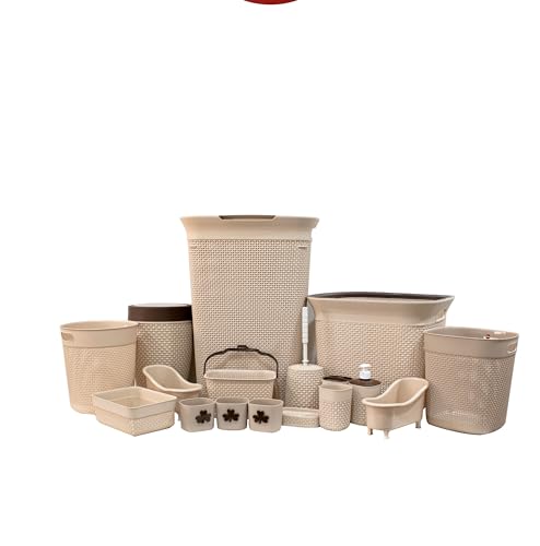 EL Watania - مجموعة سلال مكونة من 17 قطعة من الوطنية تتضمن: سلة ملابس مع غطاء وسلة ملابس وسلة مهملات بغطاء و2 سلة مهملات وفرشاة تواليت ومزوع صابون وحامل صابون و9 سلال متعددة الاستخدامات، بيج