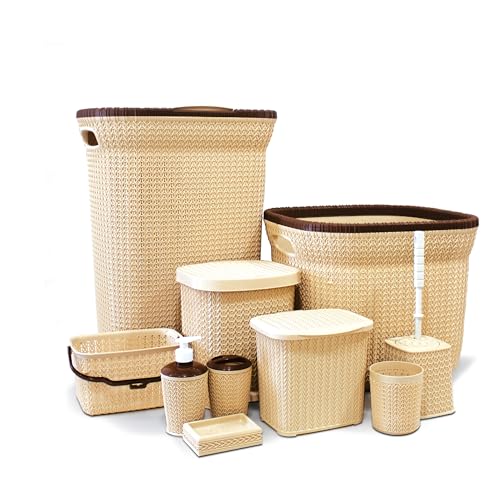 EL Watania - مجموعة سلال من الوطنية مكونة من 10 قطع تتضمن 1 سبت غسيل بغطاء و1 سبت غسيل وسلتين قمامة بغطاء و1 مضخة صابون وحامل صابون و1 فرشاة تواليت و3 سلال متعددة الاستخدامات، بيج