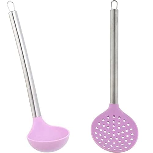 El Yassin - مغرفة ستانلس ستيل بمقبض من السيليكون والوان متنوعة + معلقة سيليكون لتقليب الطعام من ياسين، 20×28 سم