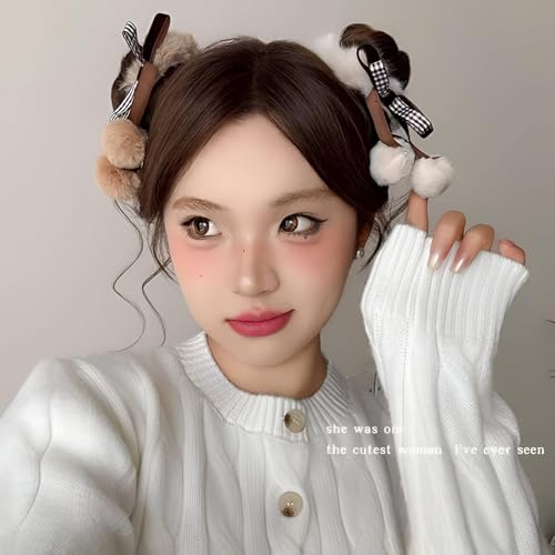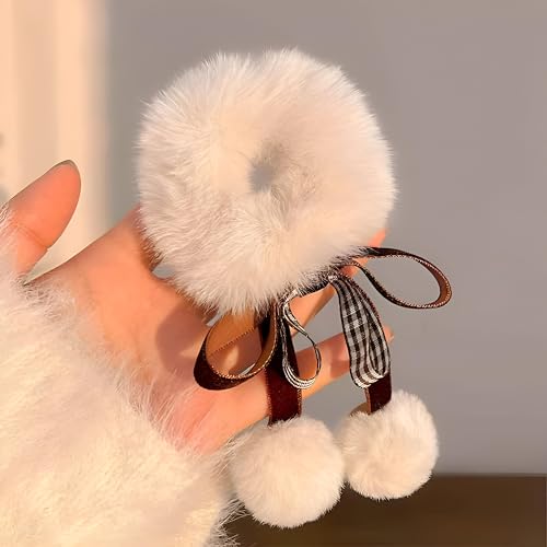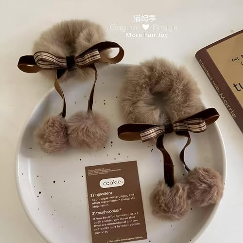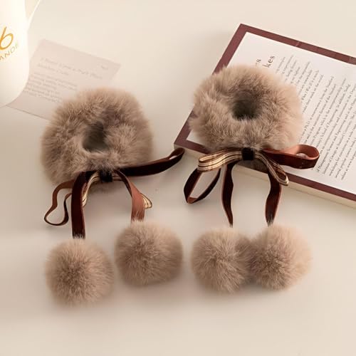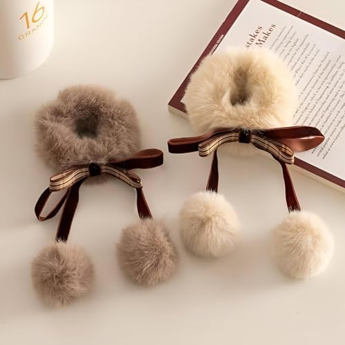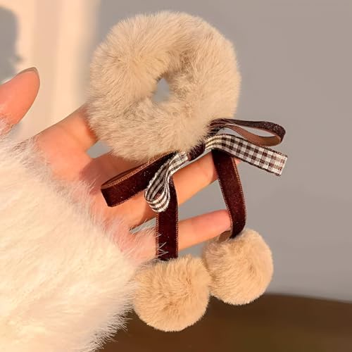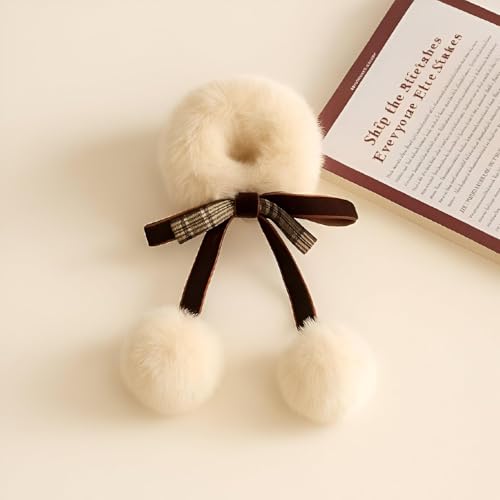 Generic - توك شعر أستك - ربطات شعر مريحة من الفرو الصناعي تتميز بفيونكة وكرات بوم، اكسسوارات شعر شتوية بلون بيج مع ألوان عشوائية مختلفة