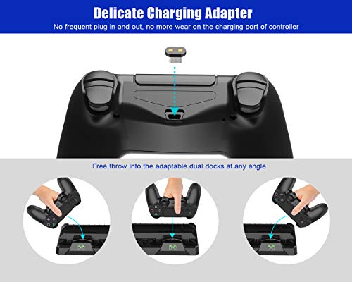 - قاعدة شحن مزدوجة لشحن 2 من ذراع التحكم اللاسلكي. منفذ بمحول ذو تصميم خاص لمنفذ USB الأمامي لأربعة أذرع تحكم دوال شوك – عدم حدوث اتصال او انفصال للذراع، عدم تلف المنفذ. يعمل من خلال منفذ USB خاص بجهاز PS4، لذا لا داعي لوصلات طاقة خارجية. نافذة LED مزدوجة لبيان حالة الشحن
