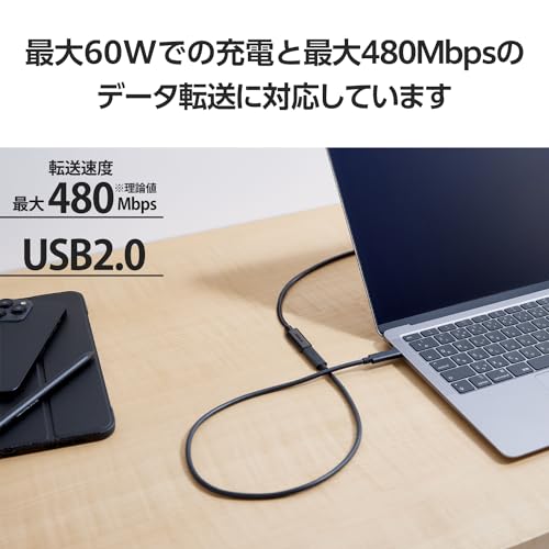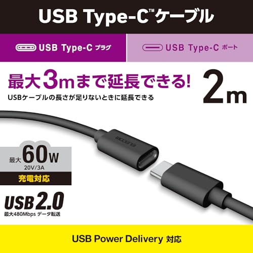 ELECOM - اليكوم كيبل وصلة USB نوع سي MPA-ECC20BK، 6.6 قدم (2 متر)، USB2.0، 480 ميجابت في الثانية، بي دي، 65 واط، اسود، لهاتف ذكي