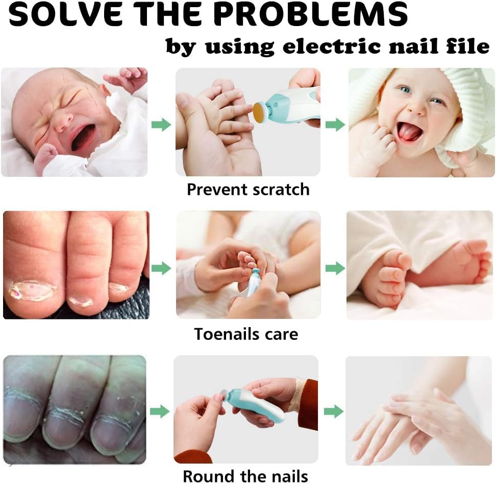 - مجموعة كاملة للعناية بالأظافر: تتضمن 6 رؤوس جلخ قابلة للتبديل مصممة لأعمار وأغراض مختلفة - رأس طحن دقيق للأطفال من عمر 0 إلى 3 أشهر، رأس جلخ لطيف للأطفال من سن 4 إلى 11 شهرًا، رأس طحن خشن للأطفال فوق 12 شهرًا، رأس طحن عمودي للبالغين، وسادة مبطنة معدنية، وسادة مبطنة بلمسة نهائية من الصوف للتلميع