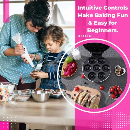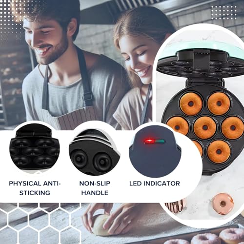 - تصنع 7 قطع دوناتس صغيرة في وقت واحد، سطح غير لاصق لسهولة التنظيف، أضواء مؤشر للطاقة والتسخين، تصميم صغير ومحمول يتضمن وصفة دوناتس بسيطة.
