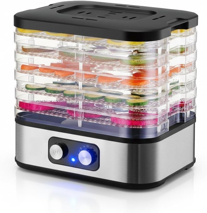 - تصميم متعدد الطبقات: مجفف طعام كهربائي بـ 5 طبقات شفافة يسمح بتجفيف كميات كبيرة من الفواكه والخضروات واللحوم والأعشاب في وقت واحد