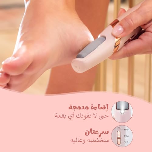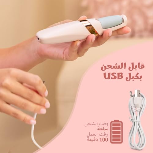 - الرؤوس المتضمنة: يأتي مع رأسين قابلين للتبديل - أحدهما خشن لتنعيم البشرة الخشنة والآخر ناعم للتلميع والتكرير.