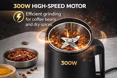 - توفر هذه المطحنة الكهربائية قوة تشغيل 300 وات تساعد على طحن القهوة والتوابل والبذور الجافة بكفاءة عالية، مع تصميم عملي للاستخدام اليومي في المطبخ المنزلي دون الحاجة إلى إعدادات معقدة.