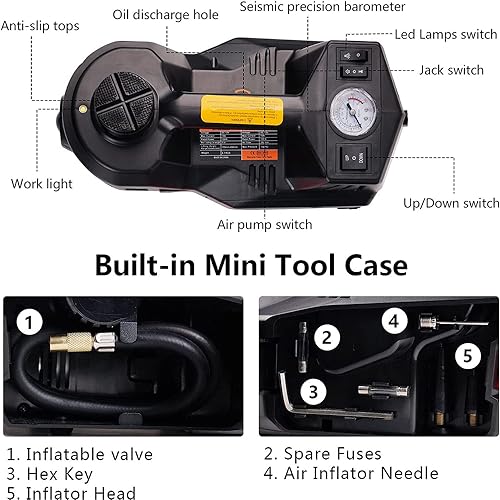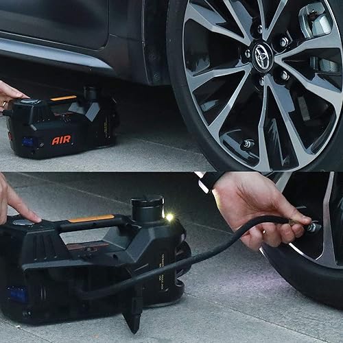 CONPEX - جاك سيارة هيدروليكي كهربائي 5 طن 12 فولت مع مضخة مدمجة قابلة للنفخ للإطارات مصباح LED بطريقتين مطرقة أمان لإمداد الطاقة لأطقم أدوات إصلاح إطارات السيارة ضمان لمدة عامين 360 درجة ضوء CONPEX