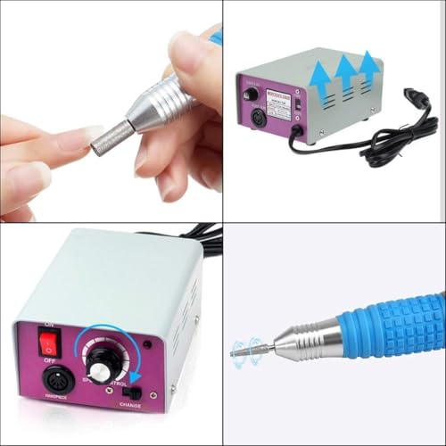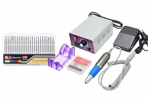 - مجموعة مثقاب الأظافر الكاملة - تتضمن آلة مثقاب الأظافر الكهربائية الرئيسية ومقبض ودواسة قدم وحامل قبضة وحقيبة 30 لقمة مثقاب ماسية وصندوق ملحقات إضافي مع رؤوس مثقاب وأشرطة صنفرة.